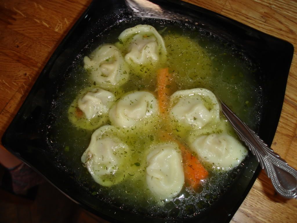 В курячий бульйон треба закинути 400 грамову пачку пельменів (равіолі) і все плов готов.
